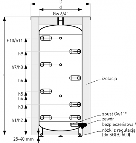 Konstrukcja zbiornika buforowego SG(B) zapewnia maksymalne wykorzystanie ciepła. Rozmieszczone na całej wysokości przyłącza hydrauliczne pozwalają zasilić instalację grzewczą różnymi temperaturami czynnika grzewczego. Zbiornik buforowy wykonany został z wytrzymałej, czarnej stali węglowej. Umożliwia to pracę bufora na ciśnieniu max. do 0.3MPa (0,6MPa, w przypadku wykonań specjalnych).