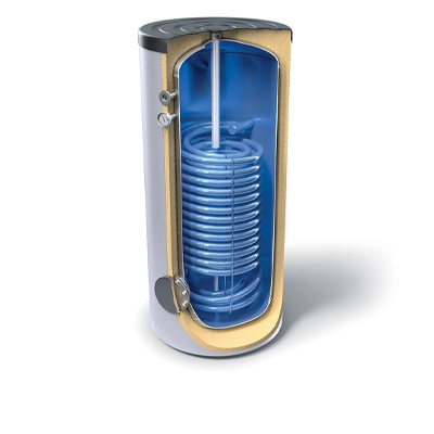 Stojący podgrzewacz c.w.u. wyposażony w pojedynczą, podwójnie zwijaną wężownicę, wykonany z blachy stalowej zgodnie z normą EN 12897. Od wewnątrz zabezpieczony wysokiej jakości powłoką emaliowaną oraz 2 anodami magnezowymi, zapewniającymi długą żywotność. Podgrzewacz posiada izolację twardą pianką poliuretanową wysokiej gęstości, która doskonale utrzymuje temperaturę wody i zwiększa efektywność energetyczną